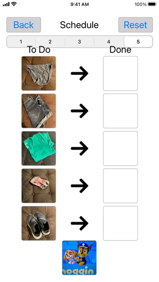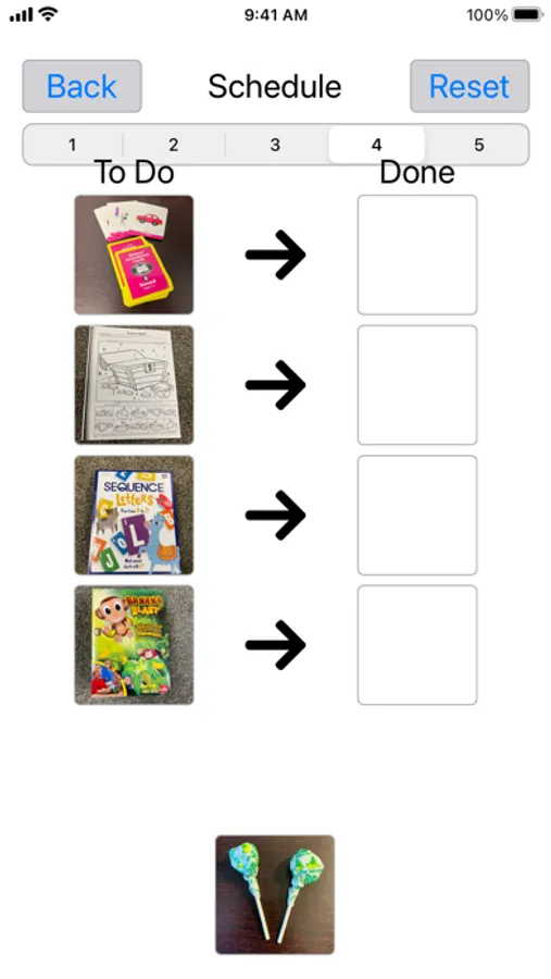 A UNIQUE feature of So To Speak is the ability to create work/activity schedules to provide organization and predictability to assist with transitions and increase sustained attention to task completion. Schedule can be comprised of 1-5 activities with space for “reward/reinforcement”. Visually displays work to be completed and work left to do. Great for classrooms and clinical settings. Can also be used to assist with home or classroom activities such as with dressing, teeth brushing, toileting, etc.