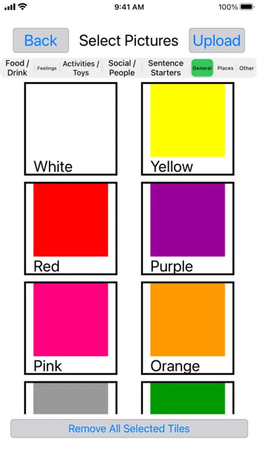 Categories include toys/activities, feelings, food/drinks, social/people, sentence starters, places, and general. There is an “other” category for the user to customize a category based on need. The application is user friendly. Good “over-the-counter” AAC system that is uncomplicated and easy to navigate. Does not require training or great skill for user and facilitator to create overlays.