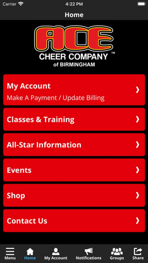 The ACE Cheer Company Birmingham app allows you to manage your account with ease, register for classes, individual lessons, camps and clinics. You will also receive important notifications about class changes, closings, registration openings, special announcements, and upcoming events.