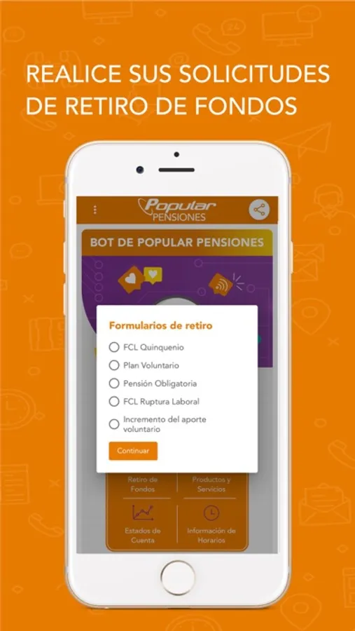 Además, puede actualizar sus datos, realizar el proceso de afiliación a cualquiera de los productos de Popular Pensiones, solicitar citas para trámites, conocer nuestras sucursales y horarios de atención.