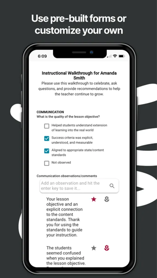Save precious time and energy by using teacher evaluation software. Provide immediate feedback to your teachers, collect data over time, and make data-informed decisions.