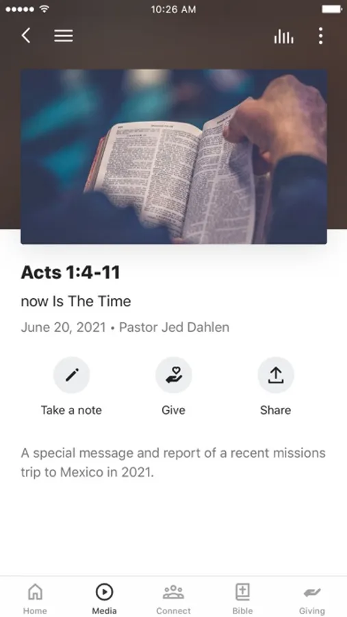 This app will help you stay connected with the day-to-day life of our church. With this app you can: watch or listen to past messages; stay up to date with push notifications; share your favorite messages via Twitter, Facebook, or email; and download messages for offline listening.