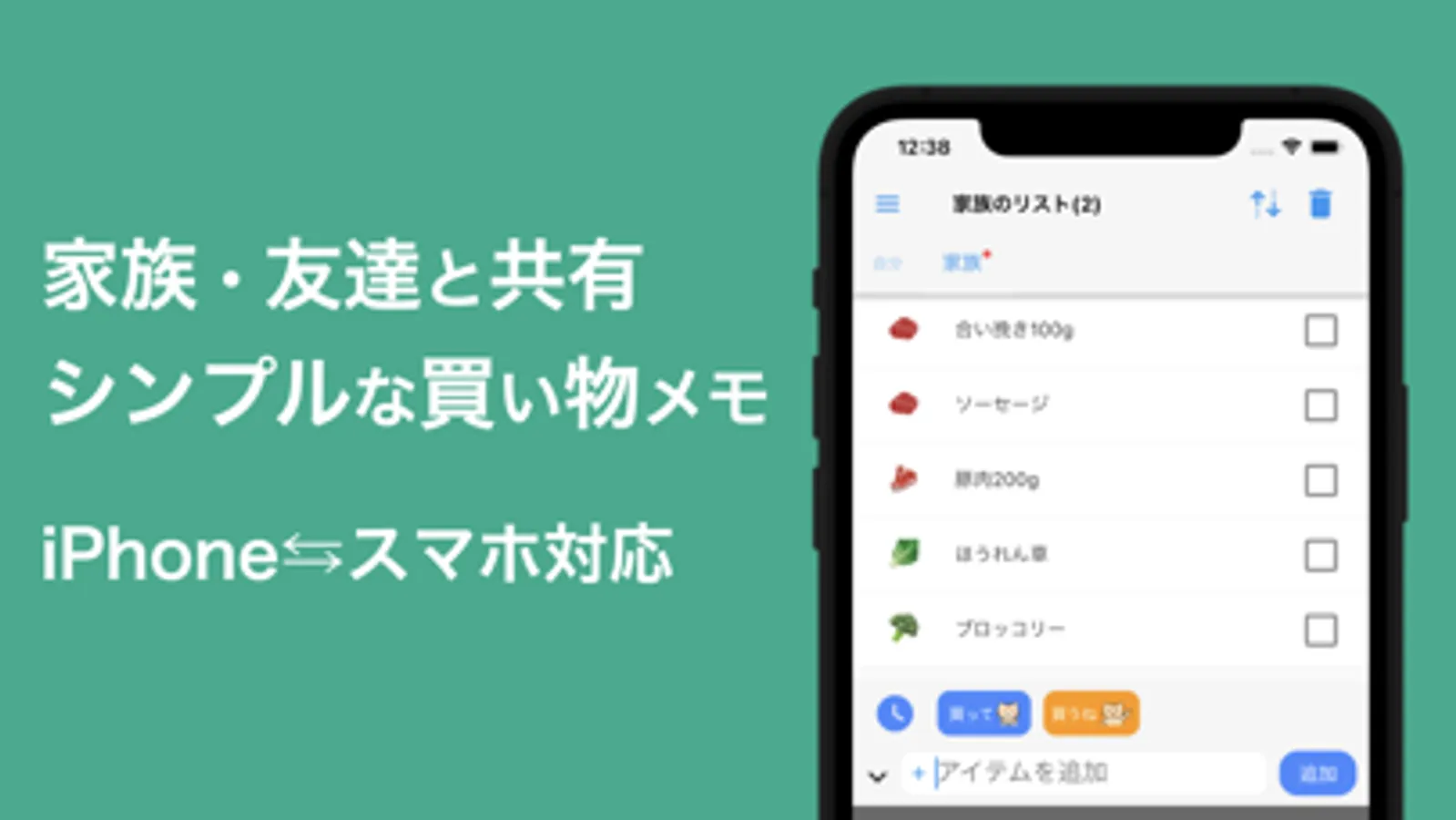 品物を追加した人は「買って」ボタンで、共有リストのメンバに通知を送信し、