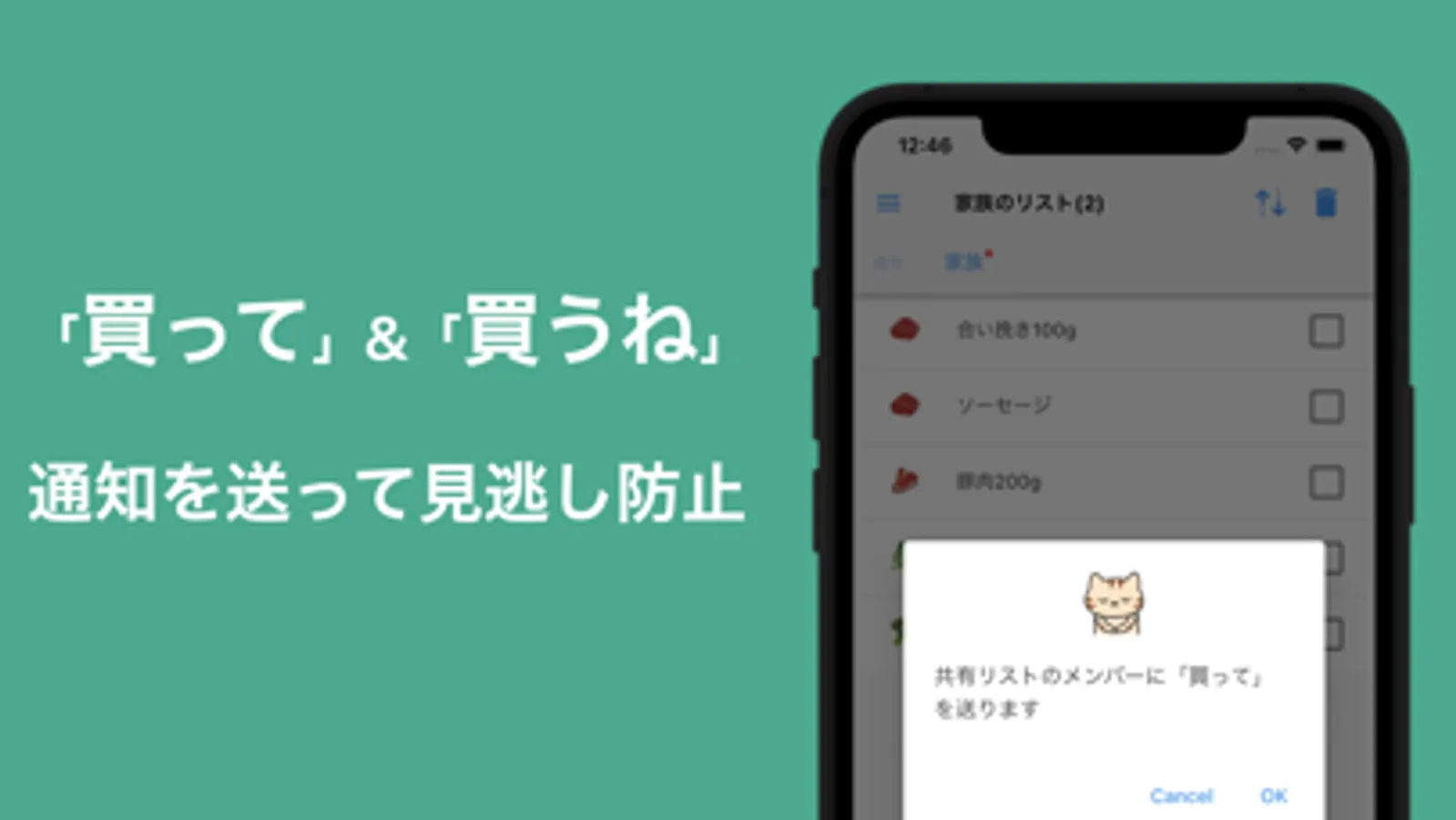 リストの更新が終わったタイミングで相手に「買って」ボタンで通知を送信できます。