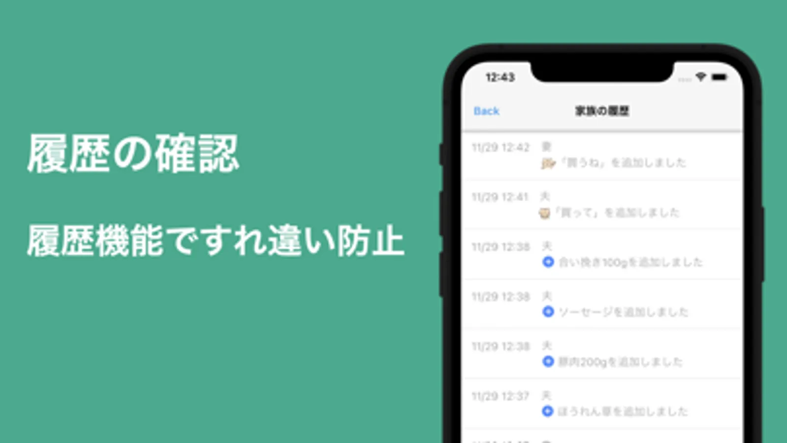 履歴画面から、相手が追加した品目・買い終わって削除した品目の履歴や、