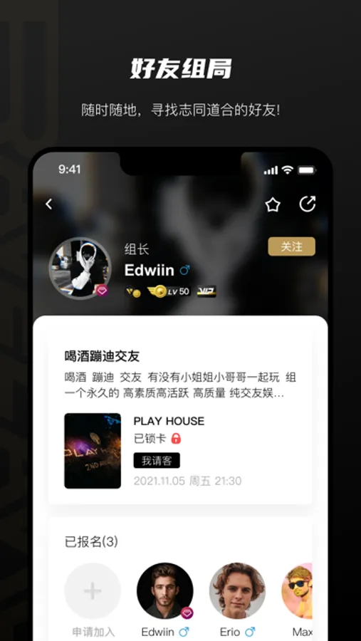 根据个人兴趣喜好推荐同城好友组局,随时随地寻找志同道合的朋友,组长请客、AA组局,由你制定。