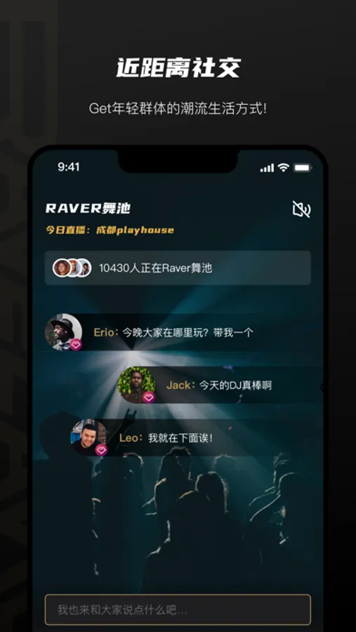 近距离发现身边的好友,以电音作为潮流文化的切入点,培育电音文化沃土,男神女神齐聚在此,匹配不同的好友,发掘有趣的灵魂,再也不会与你的那个TA擦肩而过。
