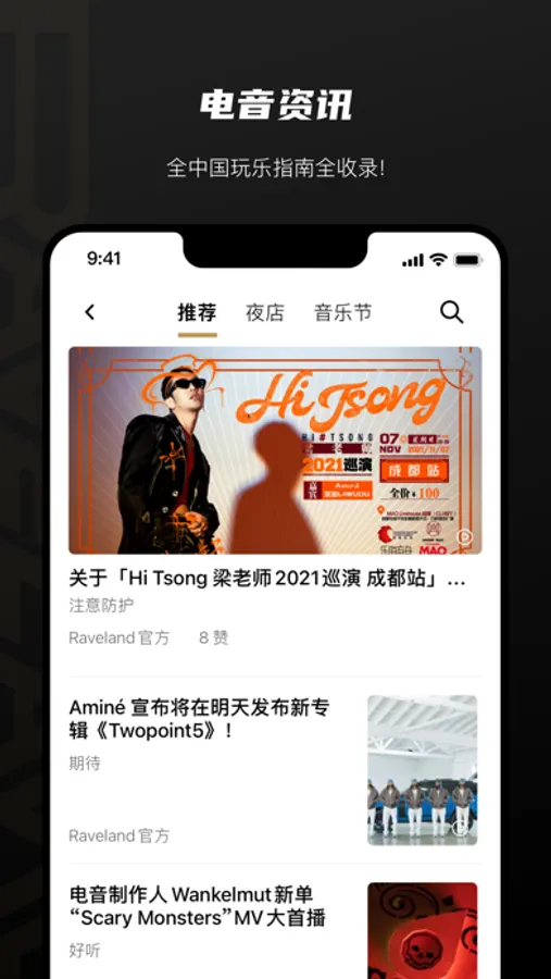 致力于提供国内外最新最快的电音资讯,夜店、音乐节、音乐人,一键直查,定位城市热门活动推荐,不放过每一个精彩瞬间。