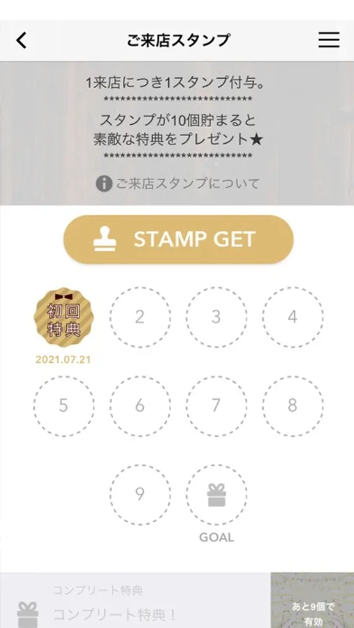 アプリ内にスタンプが貯められます。たくさん貯めていただくと次回使える特典をご用意しております。