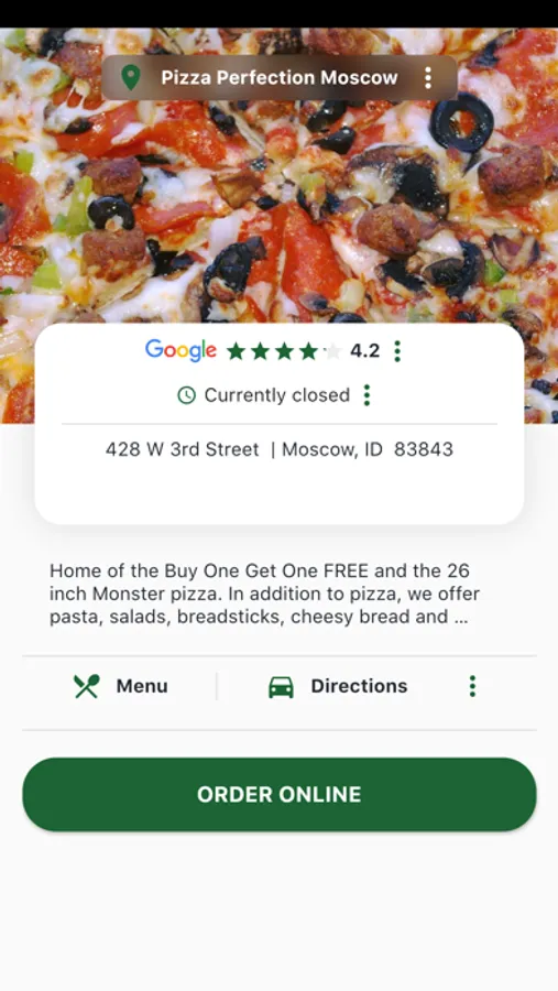 Pizza Perfection restaurant app has many different functions. It contains an online ordering link, restaurant images, address and driving directions, store hours, menus, and many other great features.