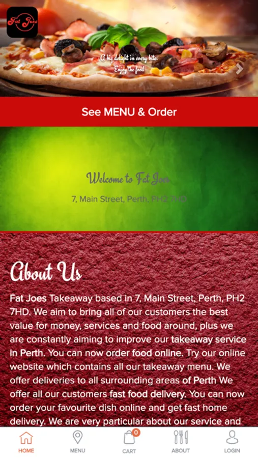 Fat Joes Takeaway is based at 7, Main Street, Perth, PH2 7HD. We aim to bring all of our customers the best value for money, services and food around, plus we are constantly aiming to improve our takeaway service in Perth. You can now order food online. Try our online website which contains all our takeaway menus. We offer deliveries to all surrounding areas of Perth We offer all our customers fast food delivery. You can now order your favourite dish online and get fast home delivery. We are very particular about our service and quality to give our customers a better experience; which is why we are now proud to offer this fantastic online ordering website. You can even pay online and get your food delivered to your home in Perth.