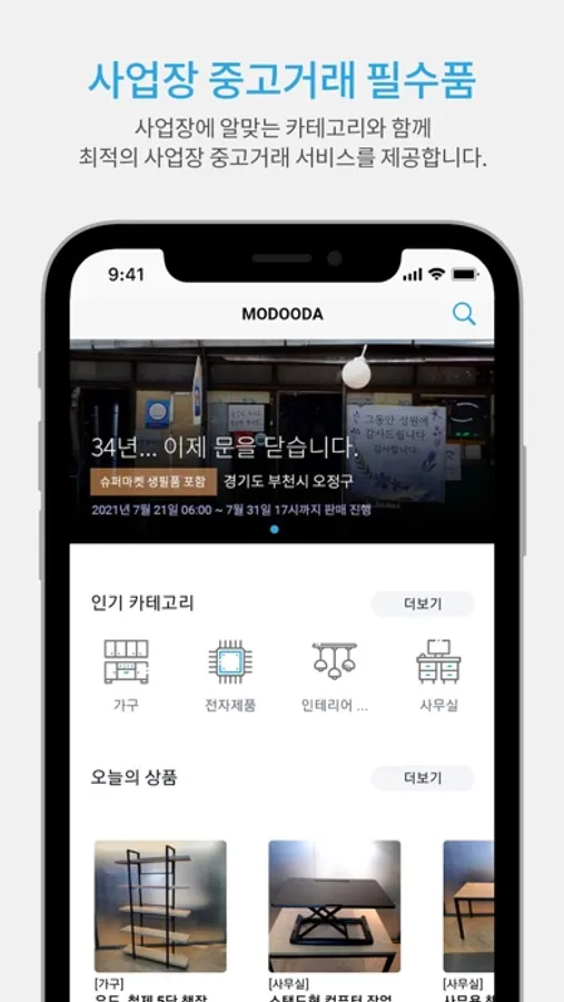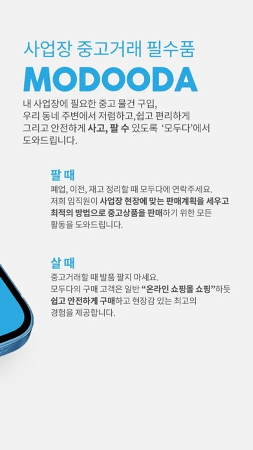 내 사업장에서 필요한 물건, 우리 동네 주변에서 저렴하고, 쉽고 편하게 그리고 안전하게 사고, 팔 수 있도록 '모두다' 에서 도와드립니다.