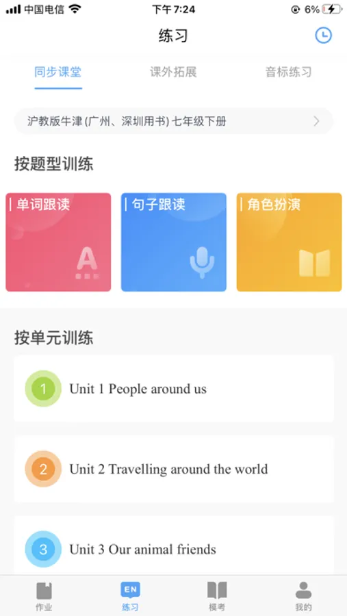1.【教材同步训练】您可以选择和您学校用一样的教材,同步练习口语,甚至还有AI“私教”帮您纠正发音。