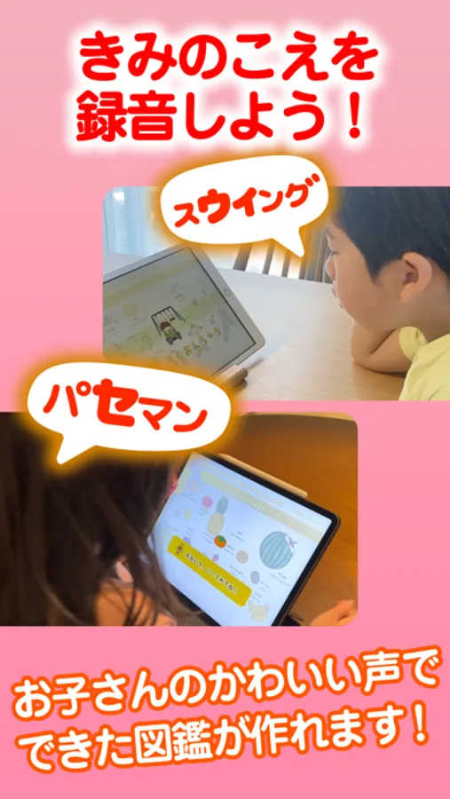 「きみのこえずかん」はネイティブ発音のお手本を真似して自分の音声を録音し、自分だけのずかんが作れる機能です。お子さまの声で作ったオリジナルのずかんは宝物!時間をおいて聞き直すことで成長を感じることもできますね。
