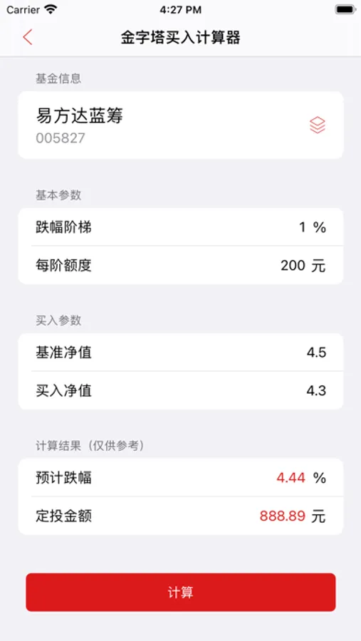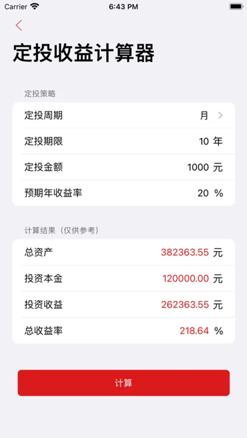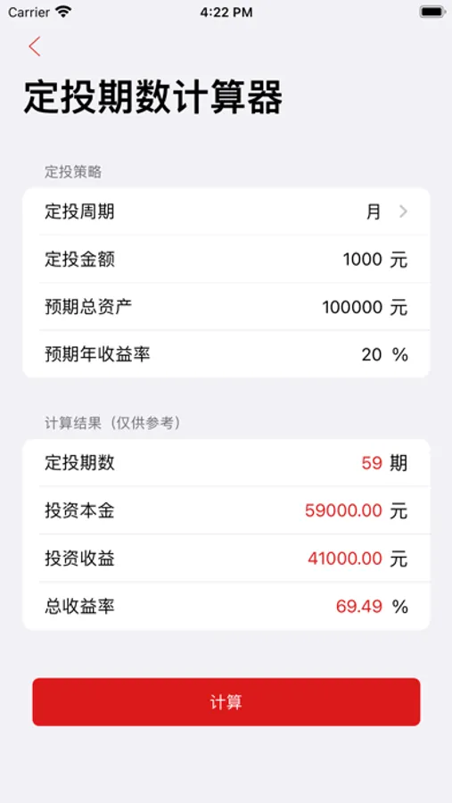 本应用包含计算定投买入金额、定投收益、定投金额等功能。