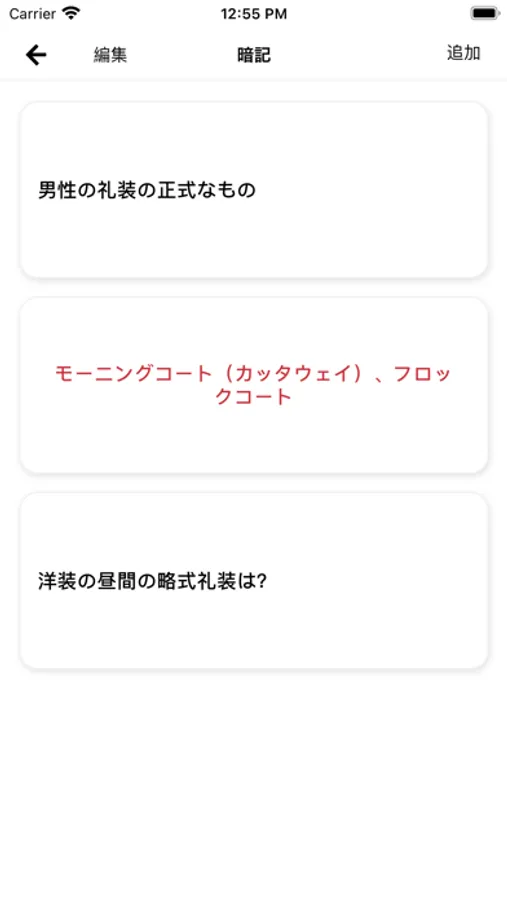・暗記モード・・・単語カードをような機能をご用意。表に問題、裏に解答が書かれた美容師国家試験の出題範囲を全て網羅した単語カードを既に用意してあります。また、自分でもオリジナルな単語カードを作成できます。もう単語カードを購入・作成する必要はありません。