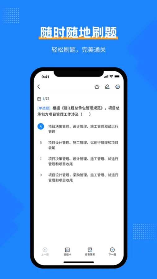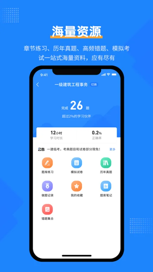 一建考试宝典是一款非常全面和专业的题库类工具App,针对一级建造师的全部科目内容,可以选择海量题库做题训练或者进行真实模拟考试,更多的真题密卷等海量资源。我们专注于一级建造师考试刷题,APP内含丰富的题库资源和题目解析,手机在线刷题针对各位在职考生轻松随时随地刷题,做最朴素且简洁好用的题库APP。1.【章节练习】根据教材章节考点系统设计的章节型题库。2.【历年真题】APP内收集了13个科目近十年的所有真题。3.【模拟考试】数套模拟试卷,助你在考前模拟考试环境,考场顺利通关。4.【高频错题】运用大数据收集考生常错题目,帮助你避过踩雷。5.【点睛提分卷】针对分数线附近的考生快速提分,成功上岸。6.【高分通关卷】更高难度等级的题目训练,帮助考生短时间突破,拿高分。7.【深度自测卷】适用于考前精准估分,深度了解自己的水平,制定目标。8.【预测试卷】根据历年考生真题大数据和出题规律,帮助你实现快速超车,完美通关!
