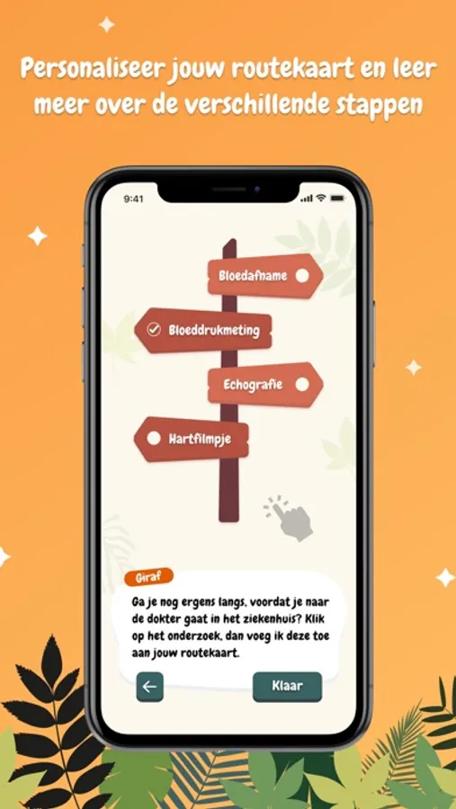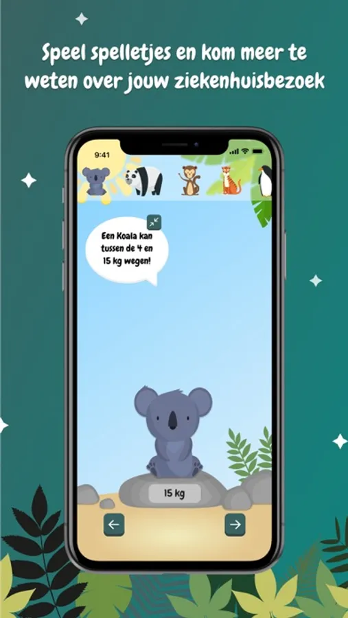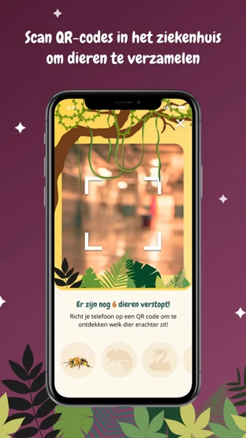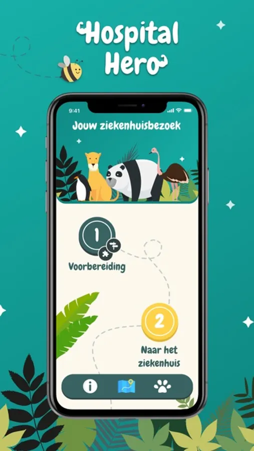 Minder stress tijdens het ziekenhuisbezoek. Met deze app kunnen kinderen die het ziekenhuis bezoeken op zoek gaan naar de dieren in het ziekenhuis. De app biedt informatie over de behandeling en afleiding door middel van een spelelement.