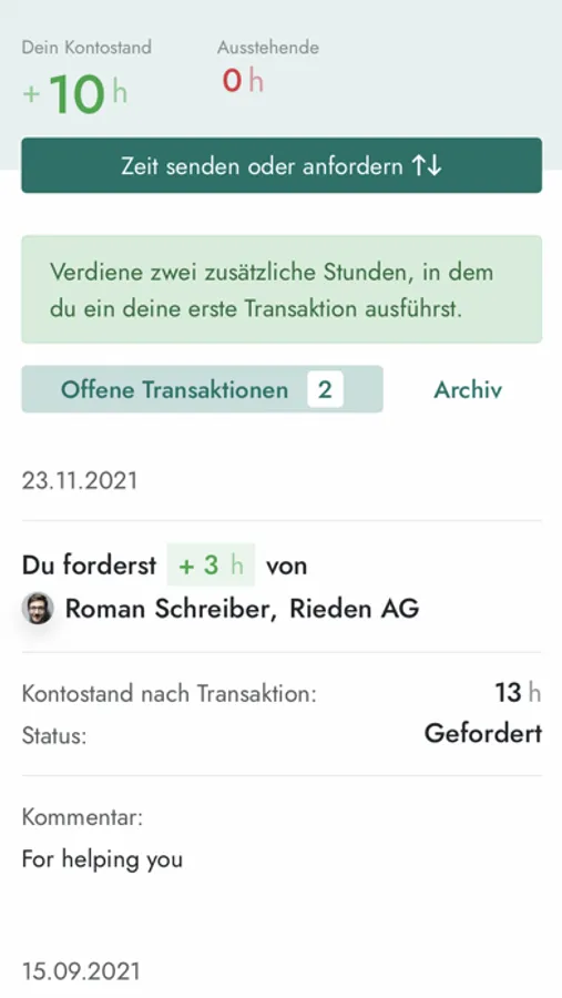 Anna unterrichtet den Nachbarsjungen Tim 1x pro Woche und erhält von Tim 1 Stunde Zeitguthaben pro Woche gutgeschrieben. Dieser Tim ist 16 Jahre alt, joggt gerne und mag Hunde. Er bietet auf der one11 Plattform an, dass er mit den Hunden aus der Nachbarschaft Gassi gehen kann. 1 Stunde Gassi gehen kostet bei Tim 1 Stunde Zeitguthaben. Er geht mit Vreni's Hund 1x pro Woche 1 Stunde Gassi und erhält somit wöchentlich 1 Stunde Zeitguthaben.