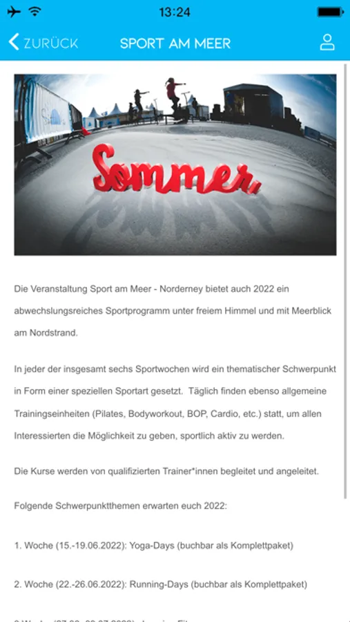 In der Sport am Meer - App findest du alle wichtigen Informationen zur Veranstaltung Sport am Meer in der Pop Up Arena - Norderney an einem Ort. Buche & verwalte deine Sportkurse, erhalte aktuelle Informationen und Updates zum Sportprogramm und trete bei Fragen direkt mit uns in Kontakt. Sport am Meer: 6 Wochen, 6 Fitnessthemen, dein Sportprogramm, dein Sommer auf Norderney.