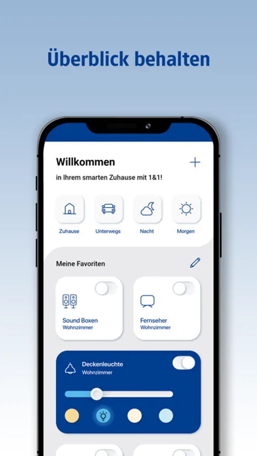 Mit 1&1 Smart Home beherrschen Sie Ihr intelligentes Zuhause mit einer Hand. Steuern Sie kompatible AVM-Smart-Home-Geräte wie z. B. LED-Lampen, Multifunktions-Taster, Heizregler oder smarte Steckdosen so, wie Sie es sich wünschen. Ob Wärme im Winter, gedimmtes Licht am Abend oder Musik zum Frühstück: In Ihrem Zuhause gelten Ihre Regeln! Dabei ist 1&1 Smart Home der perfekte Begleiter, egal ob für Einsteiger oder Profis.
