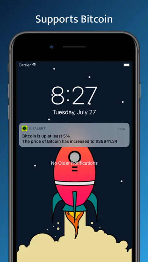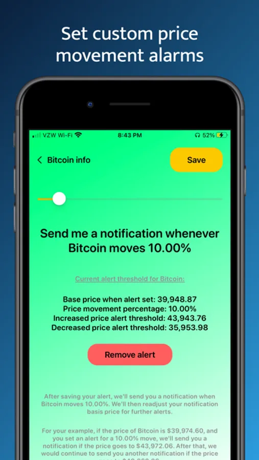 For instance, if the price of Bitcoin is trading at $50,000, you can set a custom price movement alert at 20%. This means that you'll receive a notification from us when Bitcoin moves to either $40,000 or $60,000.