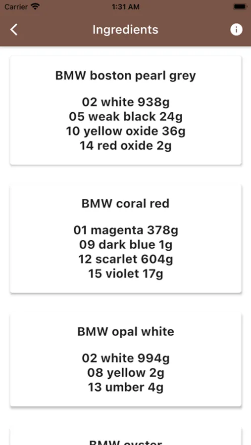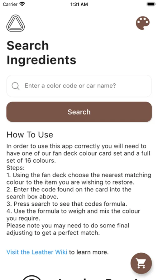 LRC Colours Help has been developed to make life easier for leather repairers. You can search ingredients for the colour mixture you need to repair your leathers. You can also find colours for your cars easily by searching car names. Search your leather's colour code in the app and you'll get the ingredients needed to create the colour mixture.