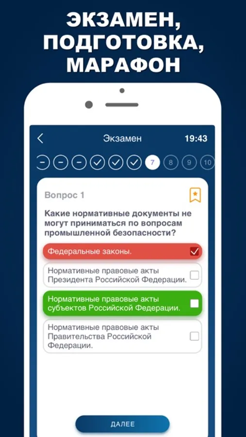 ► Режим марафона - прохождение тестирования по всем вопросам или определенной части вопросов.