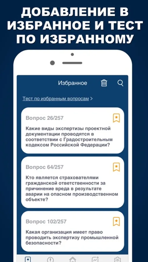 ► Избранное - можно добавлять вопросы в Избранное из всех трех режимов, а также из Топа ошибок.