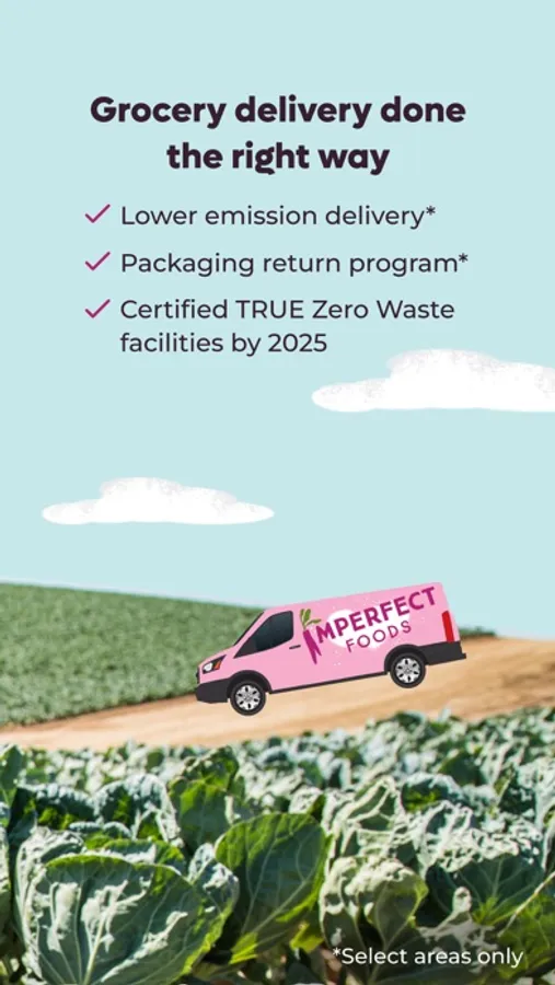 Imperfect delivers groceries to your neighborhood in one trip, with one van, helping avoid harmful CO2 emissions and extra trips to the grocery store. We’ll also take back your packaging and take care of reusing or recycling it.