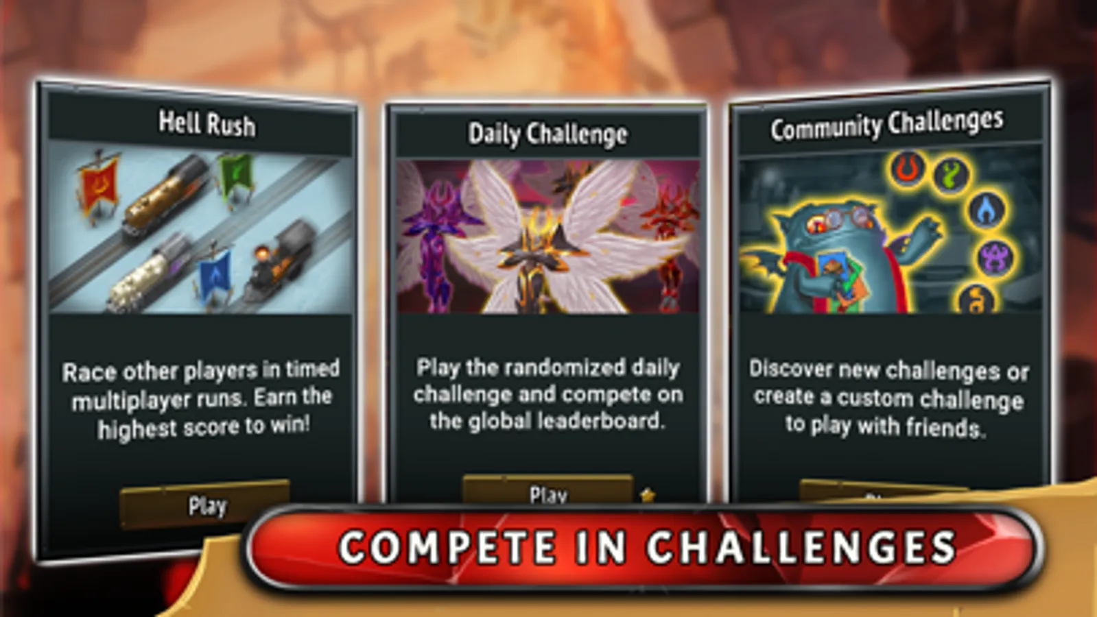 To take back hell, you’ll need to power up. Choose your route carefully, different locations yield different benefits; upgrade your Champion, recruit powerful units, upgrade cards, gain passive bonuses or duplicate any card in your deck.