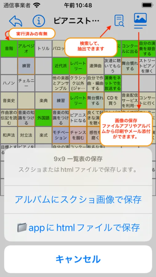 ・各マスにキーボードで目標を達成するための思考を入力し、保存することができます
