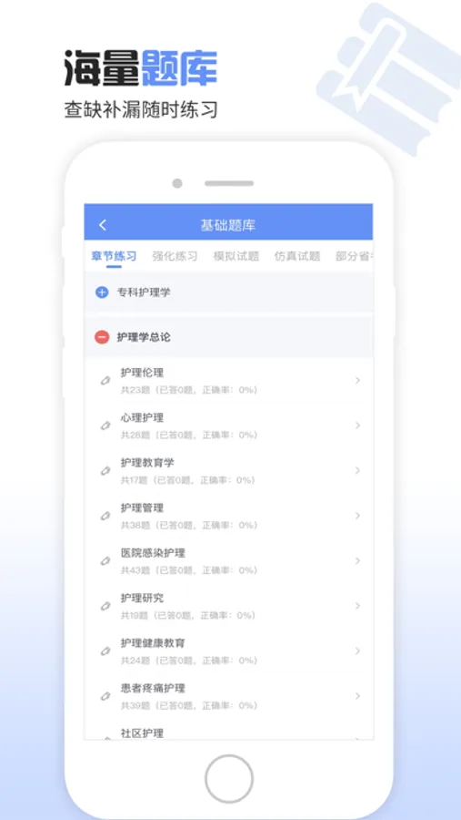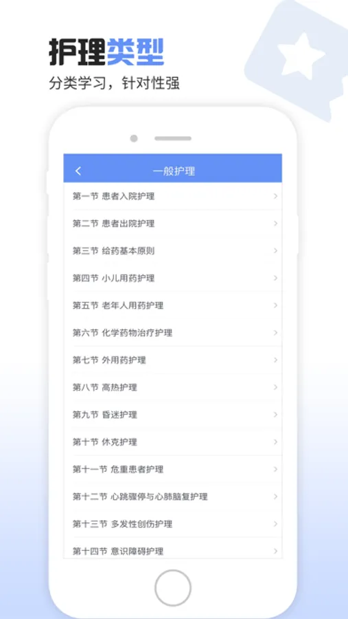 根据护理需求分为一般护理、母婴护理、老年护理、康复护理、ICU护理及疾病护理,全面的学习护理操作基本技能,利用分类的分步骤学习模式,可以一目了然随时随地学习护理知识,帮助提升护理操作水平。