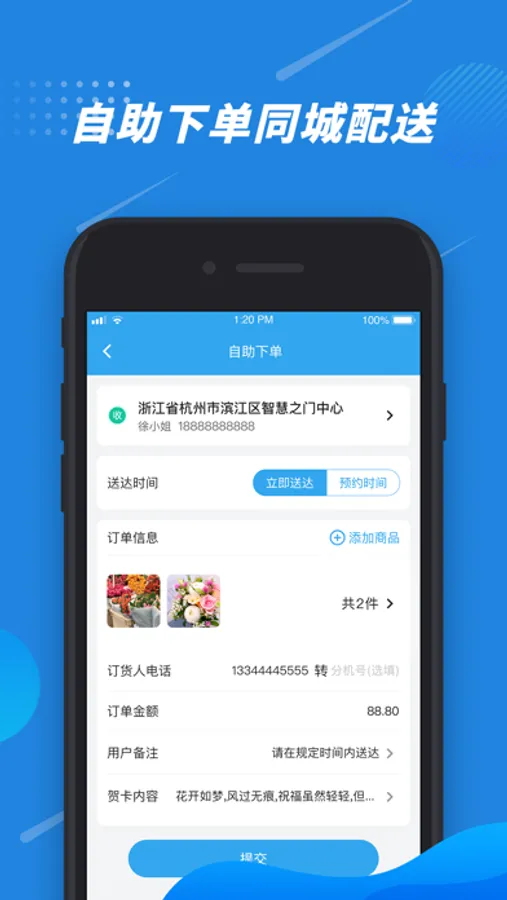 2. 配送下单 系统整合了蜂鸟、美团、达达、闪送等配送平台,可方便地进行配送比价和配送履约,帮助花店节约配送成本。