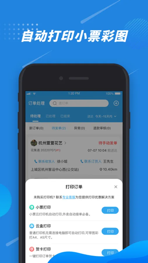 1. 订单聚合 除了支持本店线下订单及花集网订单外,还支持美团、饿了么、京东到家、抖音电商等第三方平台的订单数据同步,可实现自动接单、小票或A4彩色订单自动打印等功能,提高花店节日高峰期接单效率。