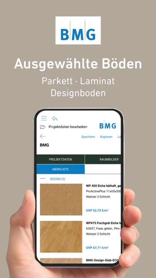Für den Fachhandwerker ist die BMG App das optimale Werkzeug zur einfachen, individuellen und erfolgreichen Kundenberatung und Bemusterung. Erhöhen Sie die Kundenzufriedenheit – mit dem BMG Bodenstudio.