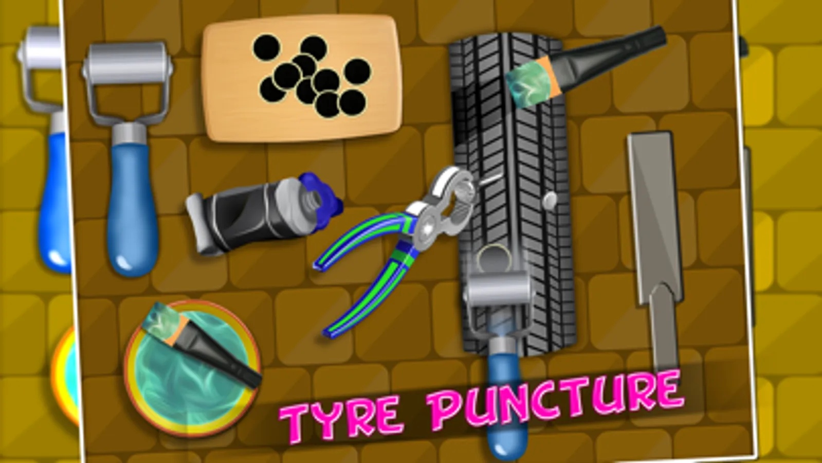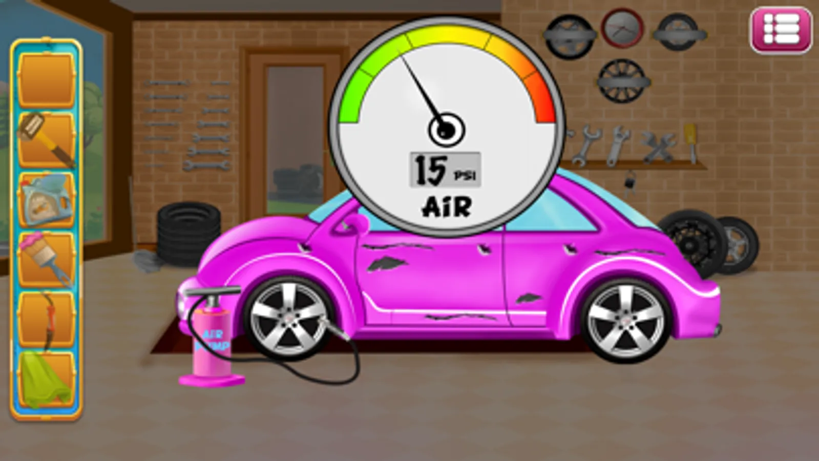 Lets get start with tyre checking take care of your tyre if it is broken apply given tools to it step by step as shown in the game to learn how it works and make it working. Use the air pump for tyres as requirement. Use hammer for car dent to fix. Fill the fuel for your super car check it when it gets full. Apply car paint where it require in your service auto workshop.
