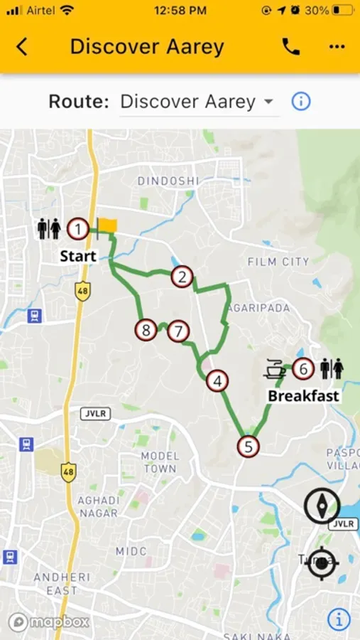 It provides navigation guidance and route maps. Registered participants need to download this app, and keep it open when on a Konkan Pedals tour. The app provides all the navigation guidance, including turn by turn navigation. Just keep the app open, and click on the compass button on the map.