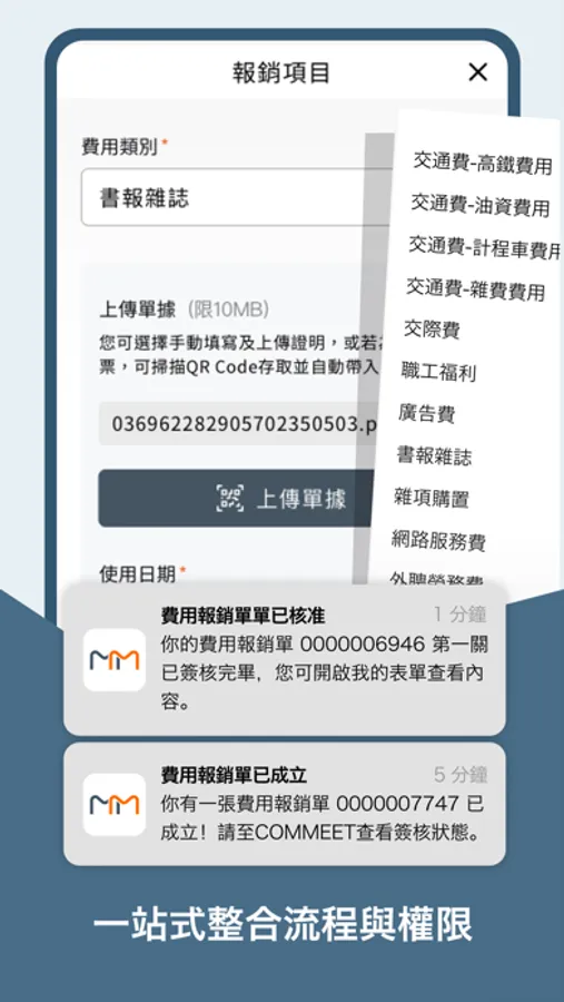 COMMEET 提供最智慧的企業費用管理,透過系統設定費用政策與簽核層級,同步掌握預算支出與消費額度控管,達成即時消費、即時管理!