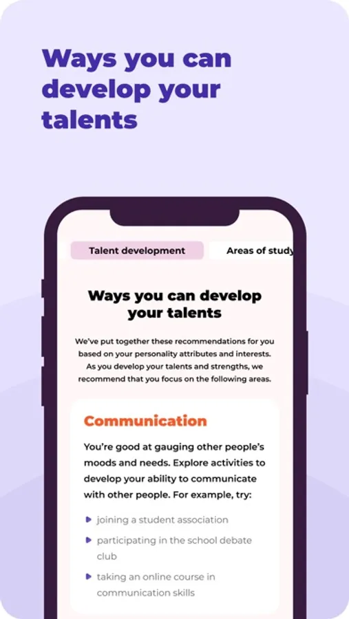 Unlike most career development and personality type tests for self assessment, Growmon gives you more detailed information to find your passion. After you finish your self discovery test you get insights about personality type, your true talents, personality traits, areas where you’ll excel in 5-10 years, interests, and study fields that match your interests, and ways to develop your talents. In short: guides to help you live a fulfilling life.