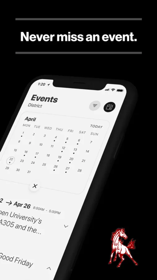 The event section shows a list of events throughout the district. Users can add an event to your calendar to share the event with friends and family with one tap.