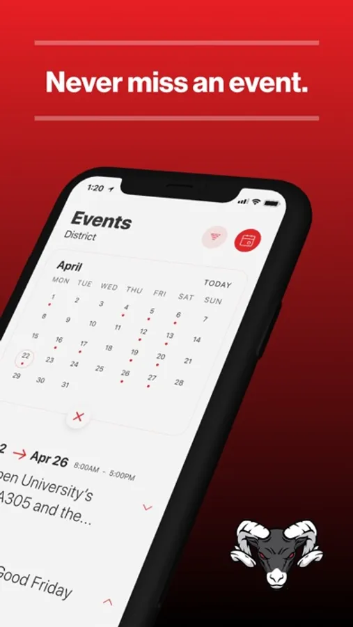 The event section shows a list of events throughout the district. Users can add an event to your calendar to share the event with friends and family with one tap.