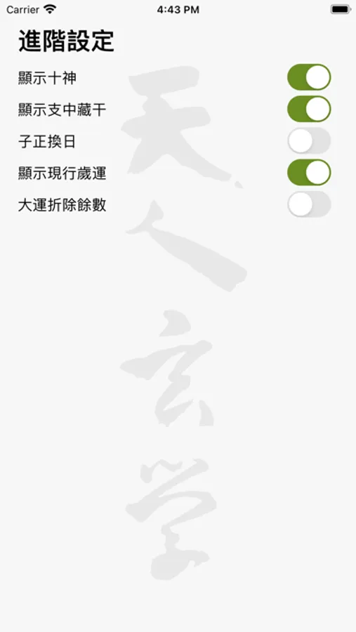 4. 可以設定是否顯示「十神」、「支中藏干」。
