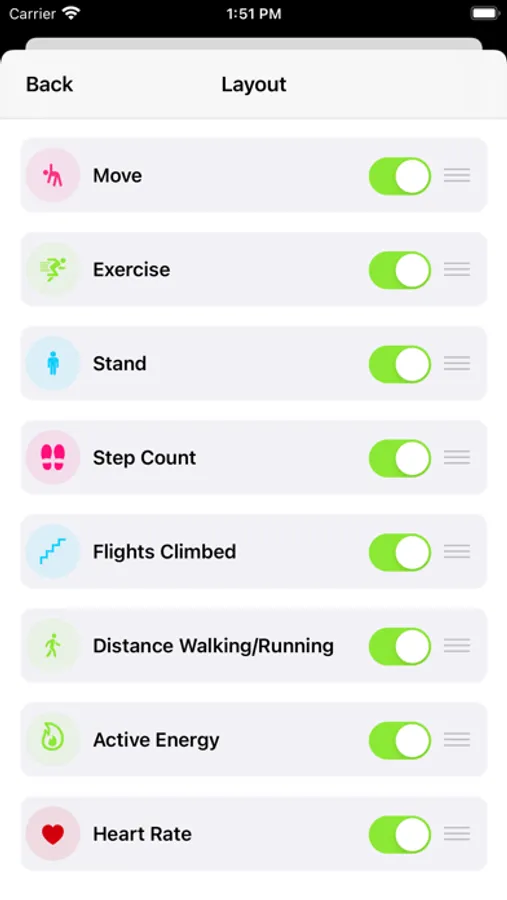 Move, Stand, Exercise, Steps, Heart Rate, Active Energy Burned, Flights Climbed, Walking Heart Rate Average, Distance Walking/Running, Weight, Resting Heart Rate, Stand Minutes, Water, Resting Energy, Swimming Distance, Swimming Strokes, Cycling Distance, and Environmental Sound Levels