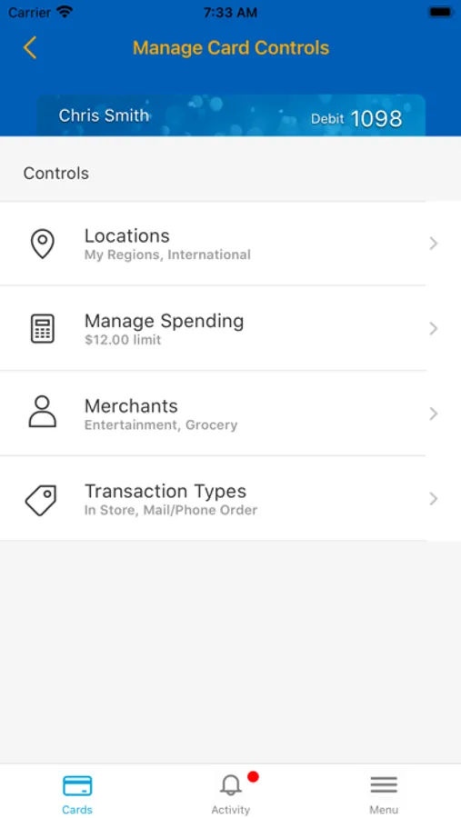 • Receive alerts when your debit card is used, approved or exceeds the transaction controls set by you