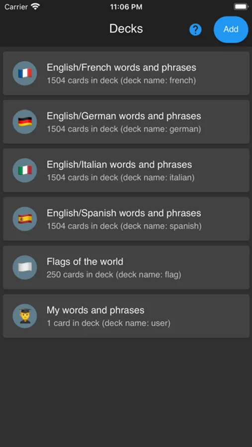 There is also a pre-loaded deck of 250 flags of nations and territories of the world (with some interesting information on location and population estimates) and a pre-loaded deck with the multiplication tables and also a user deck where you can add cards of your own.