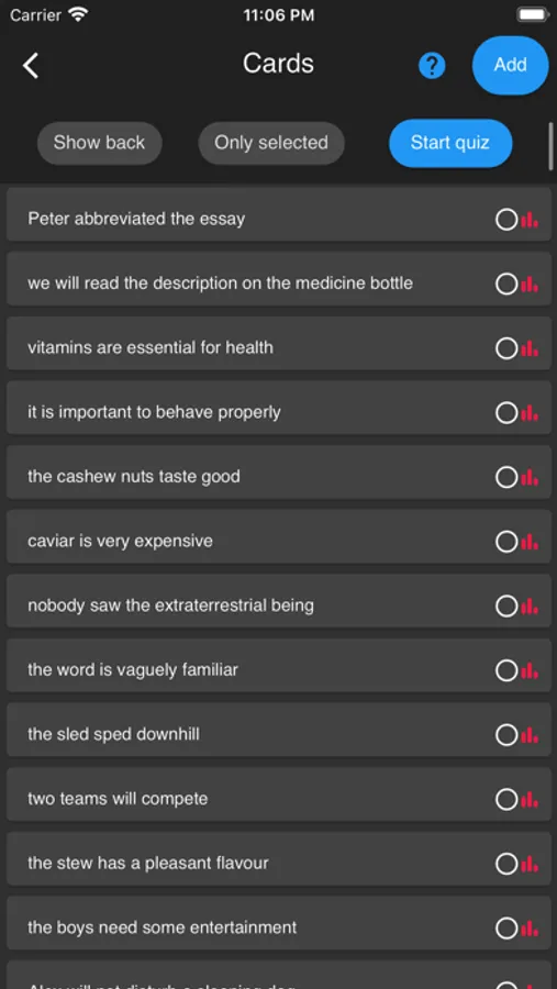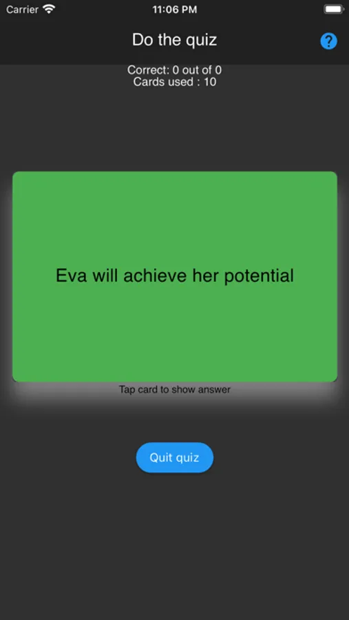 A grading system is incorporated whereby cards that were translated correctly in the quizzes get a higher grade. The user should repeat the quizzes to get all cards at the highest grade.