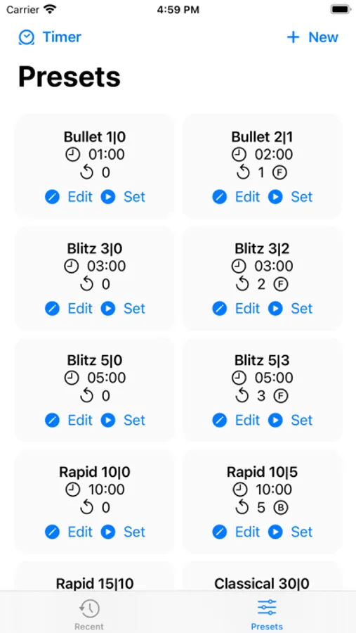 - Presets: Special pre-configured timers for standard Blitz, Rapid and classic games.