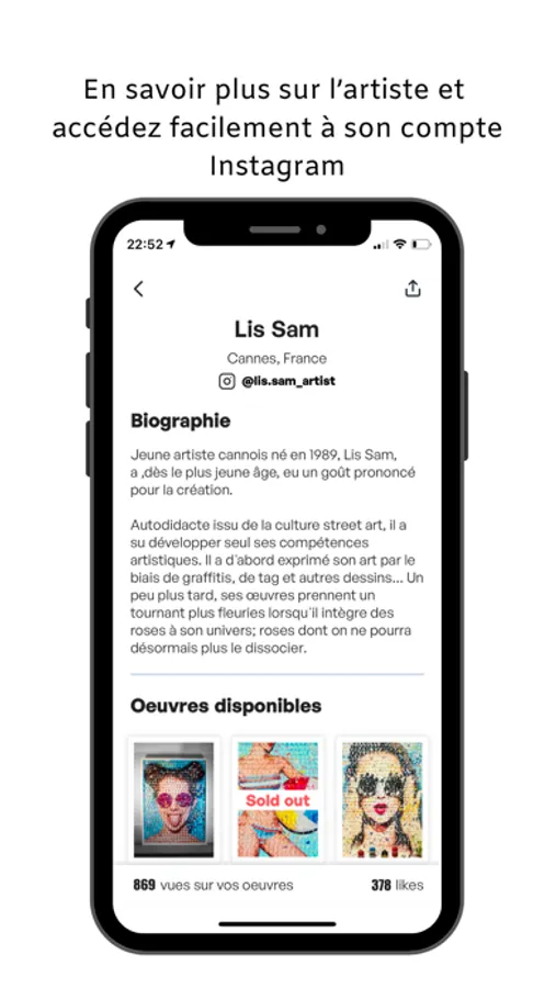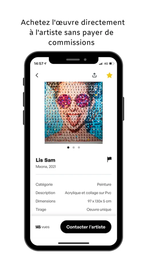 Vous aurez toutes les informations détaillées concernant chaque œuvre. Vous pourrez la partager à vos amis, et surtout vous pourrez contacter l’artiste directement, sans aucun intermédiaire.