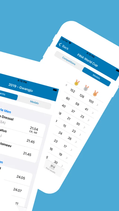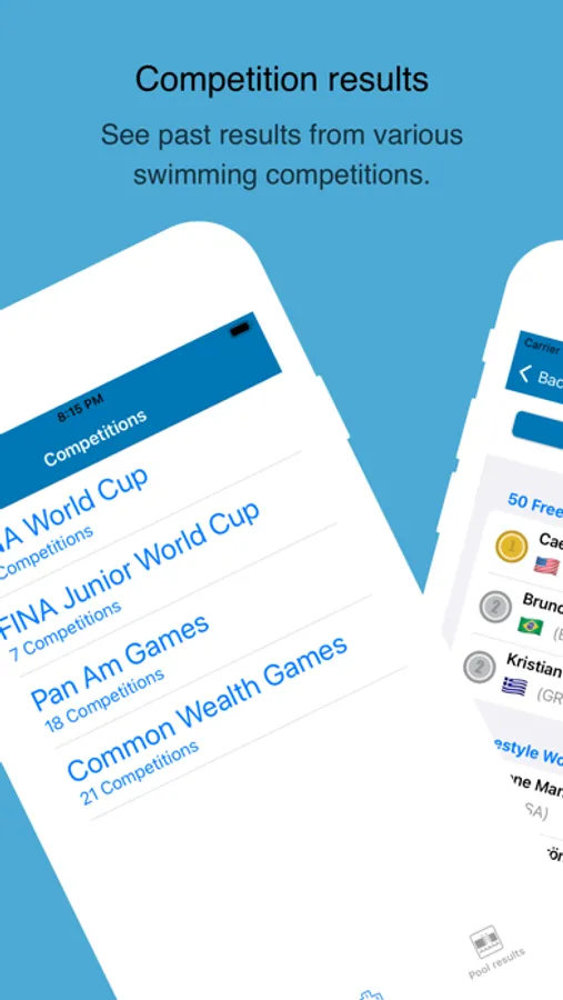 Browse through swimming results from a variety of swimming competitions, with the ability to see medal winners and their time from the Olympics, Pan Am Games, FINA Swimming World Cup and many more.